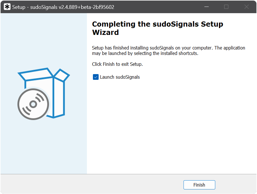 You can complete the Setup Wizard by clicking Finish. By default sudoSignals is configured to launch when installation is complete.